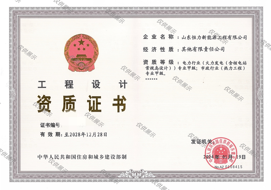 近日,山東恒力新能源工程有限公司順利通過(guò)中華人民共和國(guó)住房和城鄉(xiāng)建設(shè)部的核準(zhǔn),成功延續(xù)了電力行業(yè)(火力發(fā)電)甲級(jí)以及市政行業(yè)(熱力工程)甲級(jí)資質(zhì)。