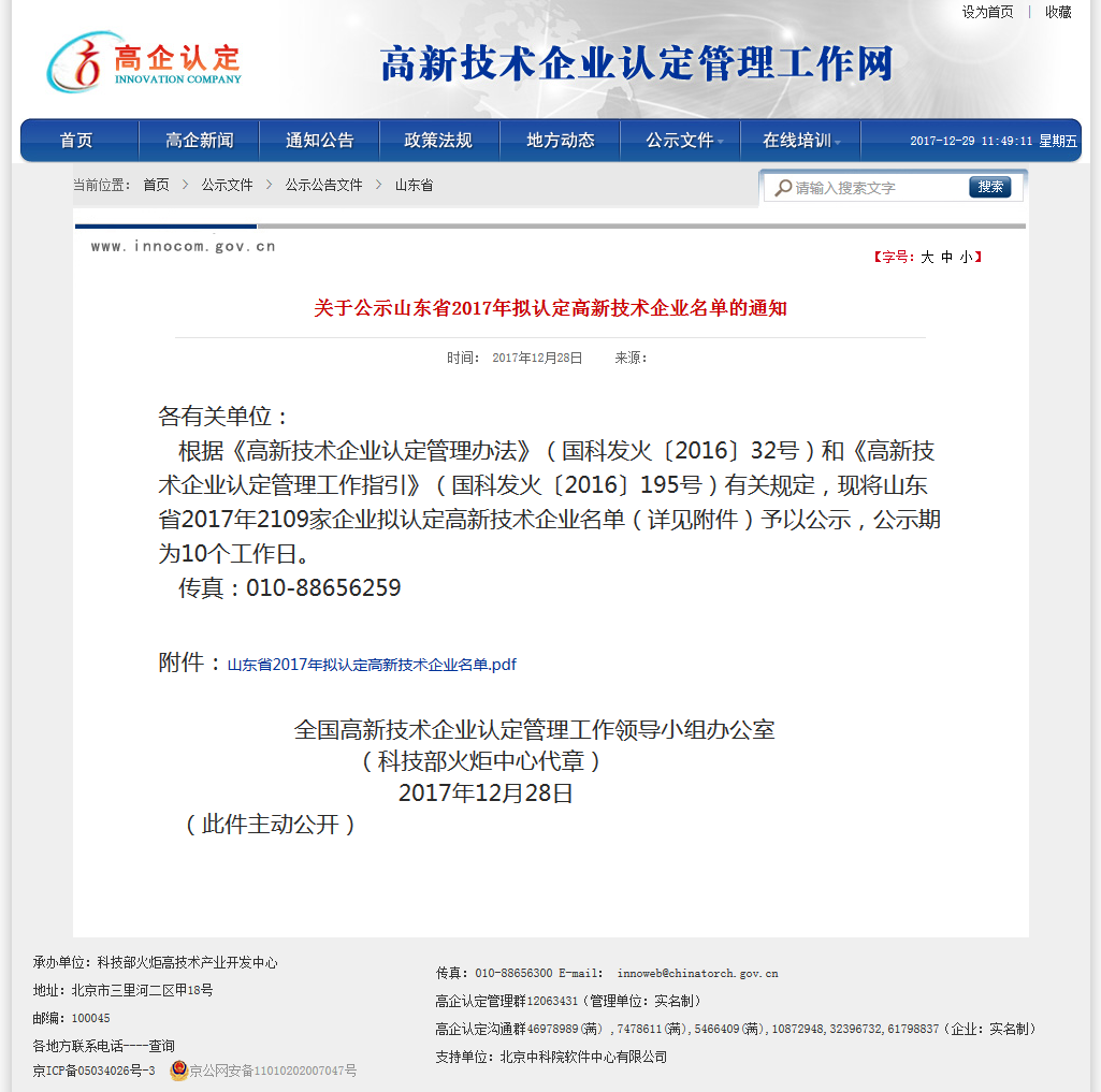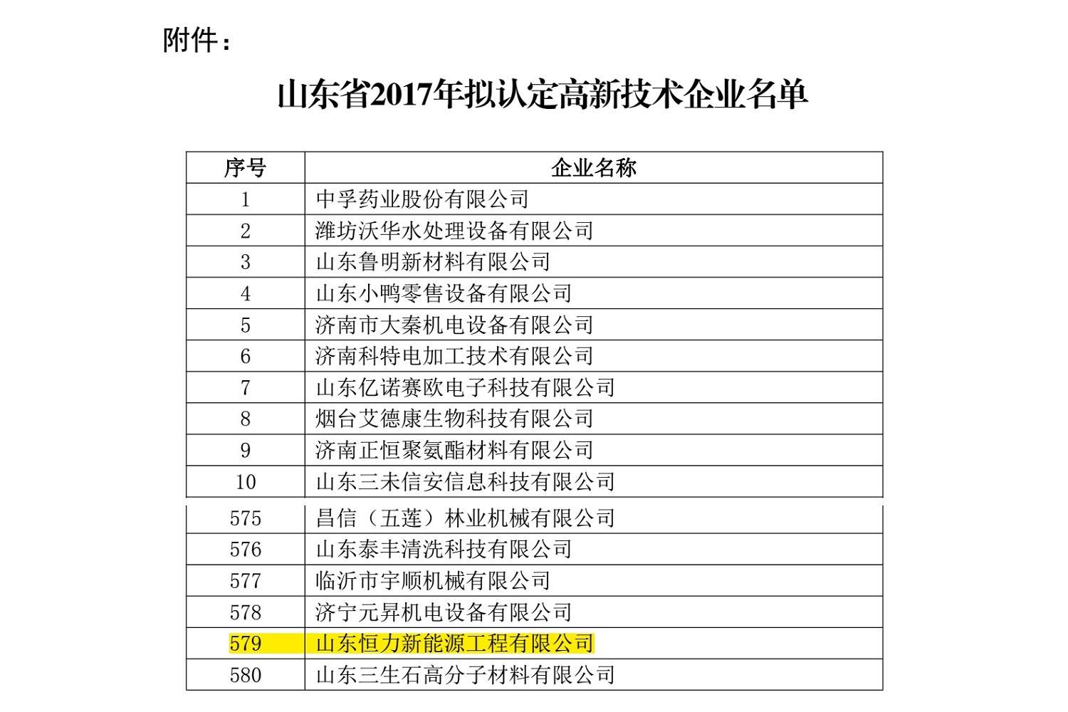 2017年12月26日,高新技術(shù)企業(yè)認(rèn)定管理工作網(wǎng)發(fā)布了“關(guān)于公示山東省2017年擬認(rèn)定高新技術(shù)企業(yè)名單的通知”,山東恒力新能源工程有限公司榜上有名。